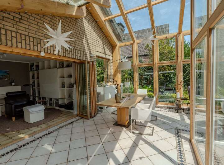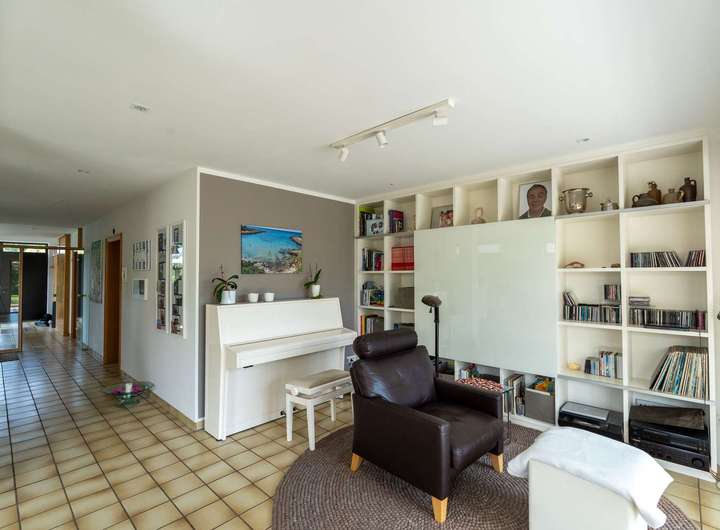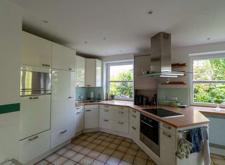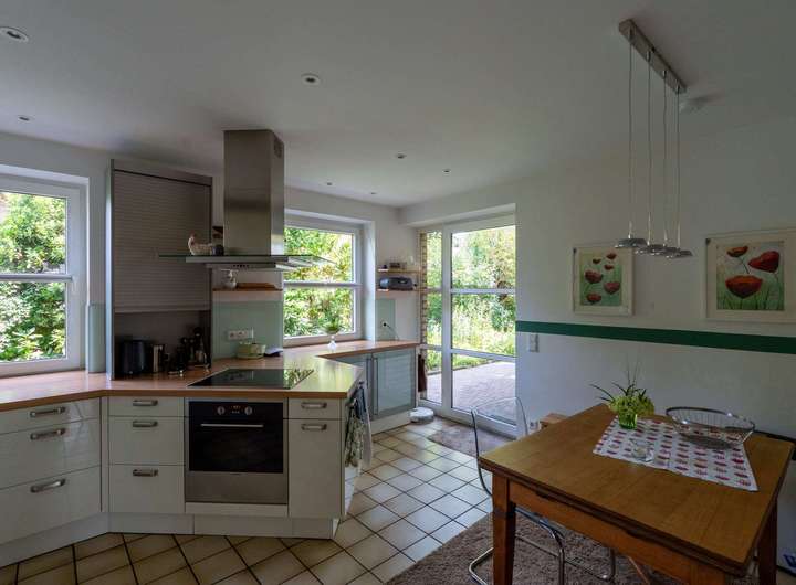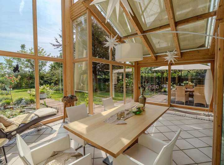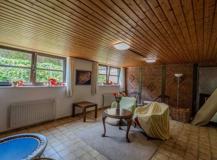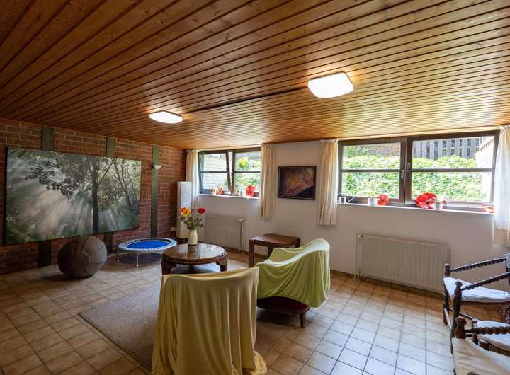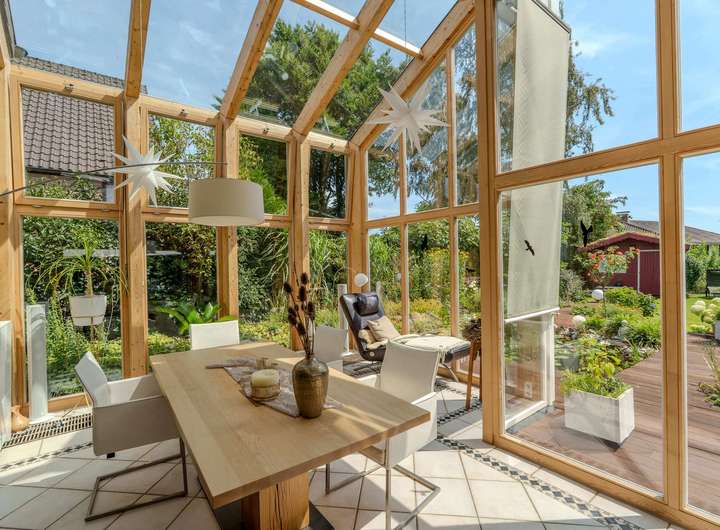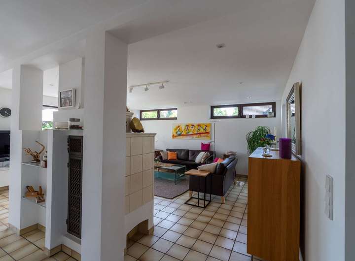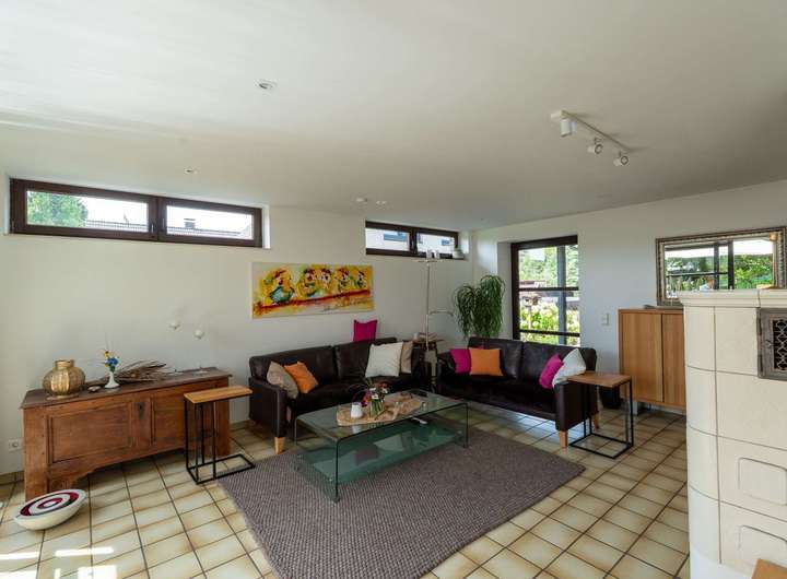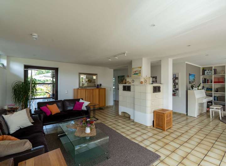 Im Erdgeschoss dominiert ein großzügiger Wohnbereich mit funktionstüchtigem Kachelofen und einem offenen Übergang in den 1999 genehmigten Wintergarten – ein Ort zum Wohlfühlen zu jeder Jahreszeit. Vom Wohnzimmer sowie von der Küche (nicht im Kaufpreis enthalten) haben Sie direkten Zugang zu den verschiedenen Terrassen, die den Garten umrahmen und vielfältige Rückzugsmöglichkeiten bieten.