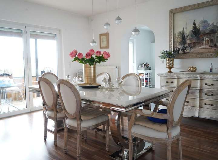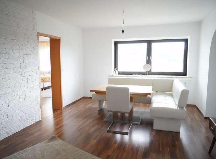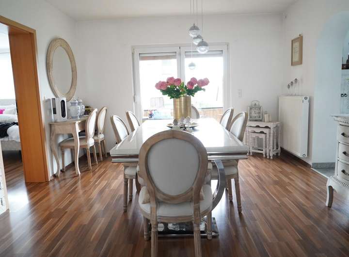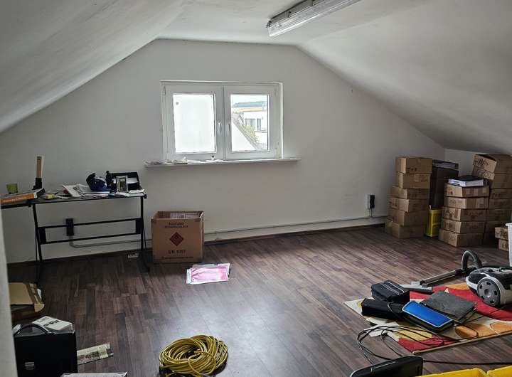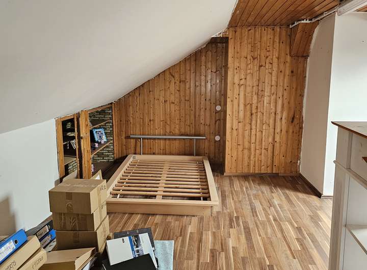 Im Obergeschoss spiegeln sich die Wohnqualitäten wider – auch hier verbinden sich Wohnen und Essen in einem offenen Raumkonzept, ergänzt durch einen gemütlichen Balkon. Das Dachgeschoss wurde ehemals als Büro genutzt und dient heute als Lagerfläche. Mit überschaubarem Aufwand lässt sich hier jedoch weiterer Wohnraum schaffen – sei es für Kinder, Gäste, Homeoffice oder eine Einliegerlösung.