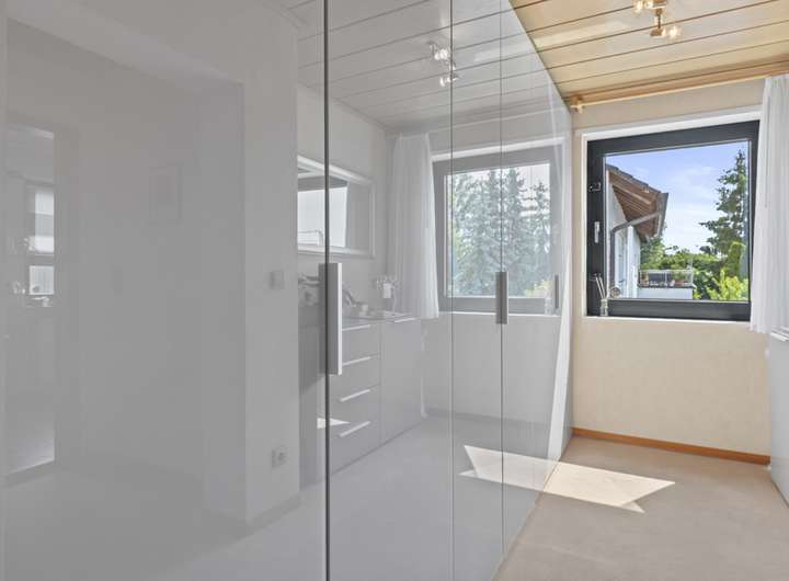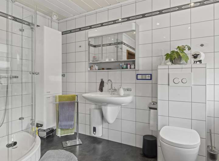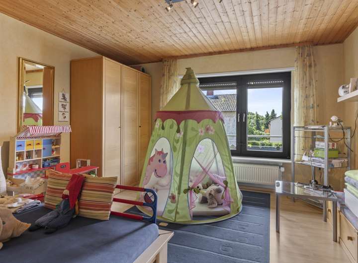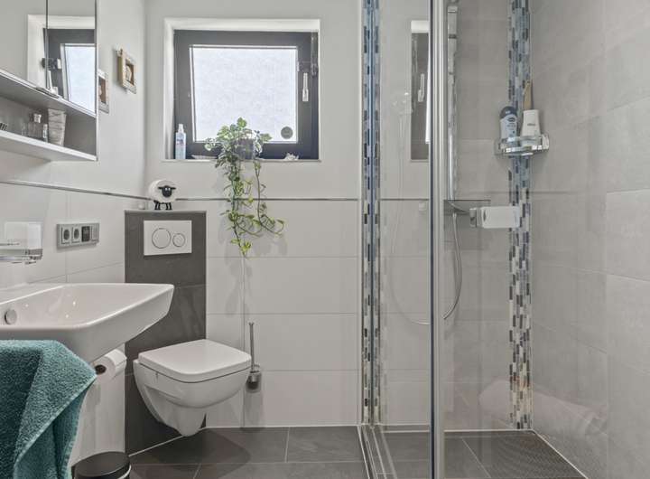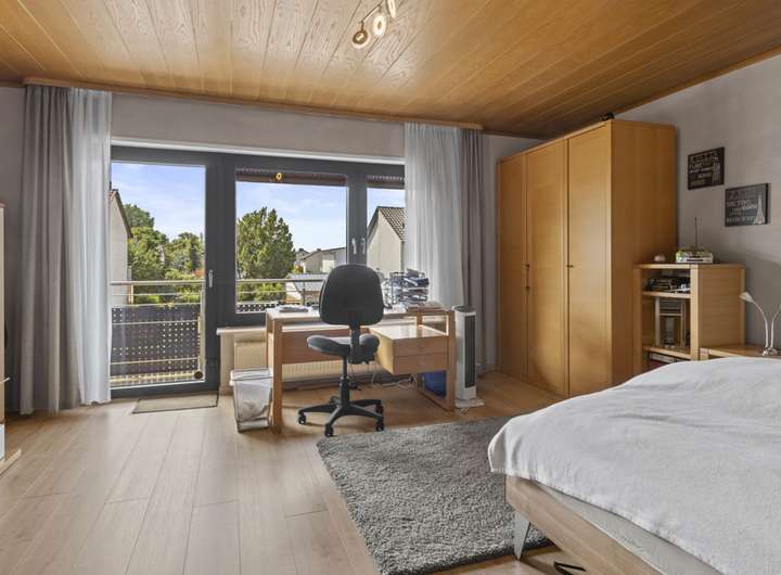 Im Obergeschoss befinden sich drei gut geschnittene Schlafzimmer mit Zugang zum Balkon, ideal für Eltern, Kinder oder auch ein Homeoffice. Das Tageslichtbad ist mit einer Dusche und Badewanne ausgestattet und bietet genügend Platz für die ganze Familie.