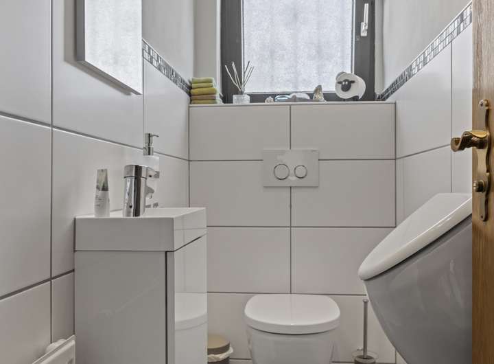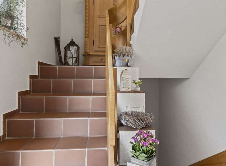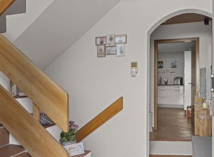 Im Erdgeschoss empfängt Sie ein heller Eingangsbereich mit einem zentralen Treppenhaus, das alle Etagen vom Keller bis ins Obergeschoss verbindet. Weiterhin befindet sich im EG ein Gäste-WC und ein offener Wohn- und Kochbereich.