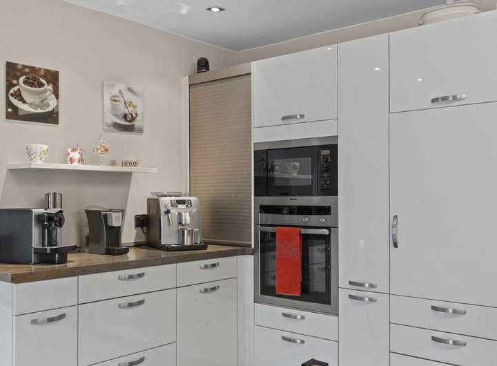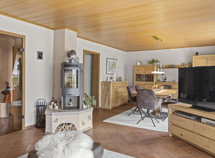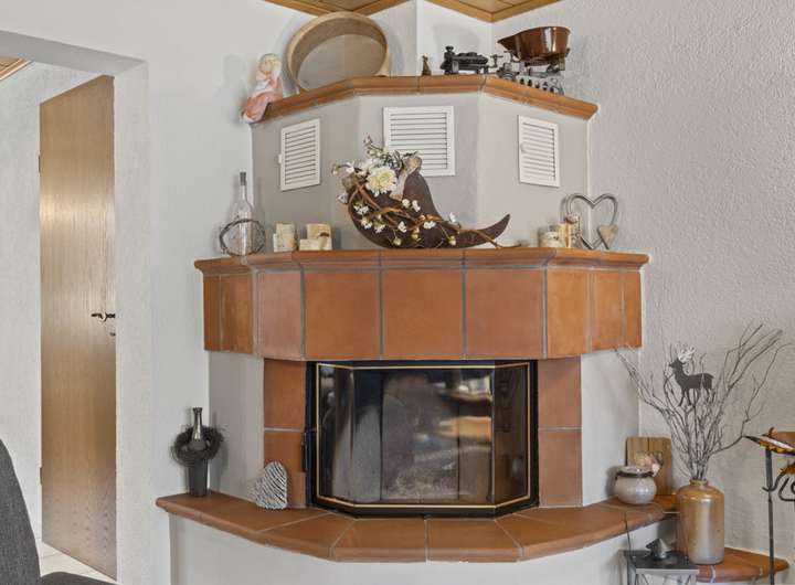 Ein gemütlicher Kamin schafft eine behagliche Atmosphäre, während die moderne Einbauküche mit hochwertigen Elektrogeräten zum gemeinsamen Kochen und Genießen einlädt.