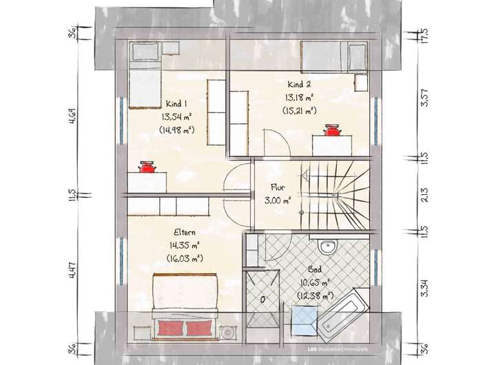 Im OG befinden sich zwei nahezu gleichgroße Kinderzimmer, ein Elternschlafzimmer, das große moderne Badezimmer und ein Abstellraum.