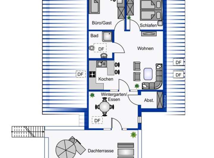 Über eine Stahl-Außentreppe gelangen Sie hier auf die herrliche Dachterrasse und in die Wohnung. Der "wintergartenähnliche" Essbereich und die Dachterrasse bieten ebenfalls einen fantastischen und fast panoramaartigen Ausblick. Eine neuwertige und gepflegte Einbauküche (im Kaufpreis enthalten) in dem offenen Wohn- und Kochbereich ist hier bereits vorhanden, das Duschbad wurde ebenfalls im Jahr 2015 saniert.