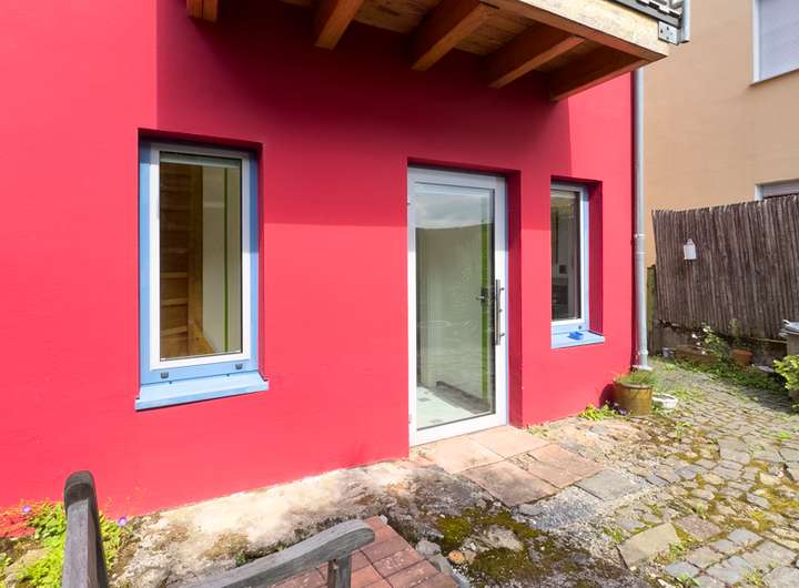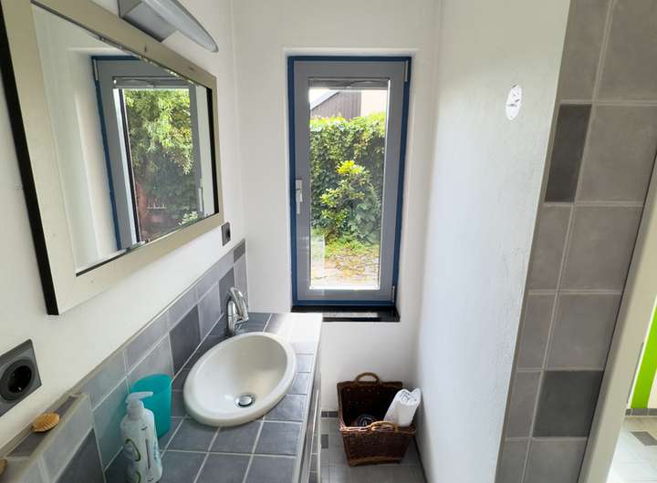 Der Anbau von 2003 erweitert das Haus um ein weiteres Schlafzimmer bzw. Kinderzimmer mit direktem Zugang zum Balkon. Über ein separates Treppenhaus gelangen Sie von hier ins Erdgeschoss über einen schmalen Flur in ein modernes zweites Badezimmer mit bodengleicher Dusche, WC und Waschtisch. Über den schmalen Flur betreten Sie durch eine eigene Tür den kleinen, aber sehr schön angelegten Bauerngarten mit Basaltsteinpflaster, begrünten Flächen und einem liebevoll angelegten Nutzgarten mit Bank.