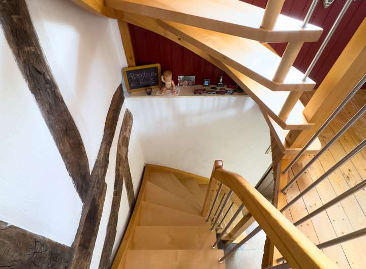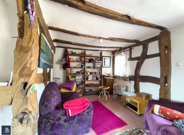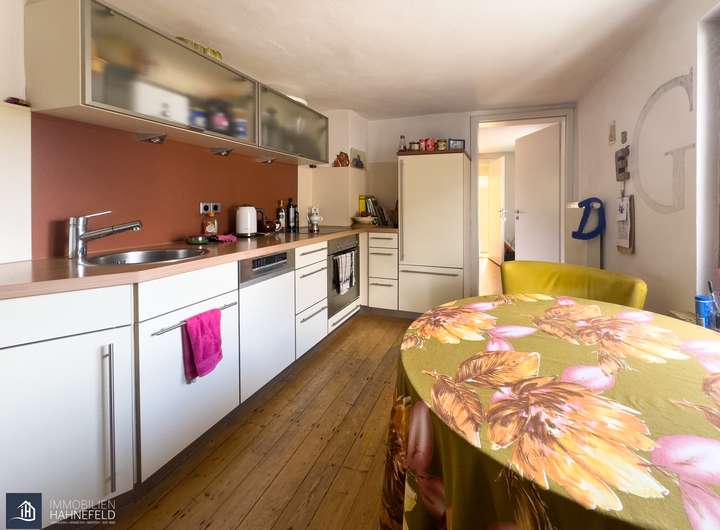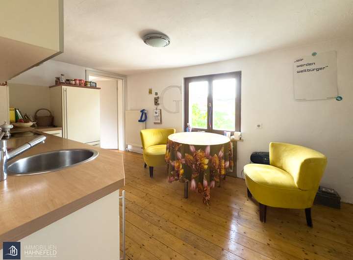 Im Obergeschoss wurde eine gemütliche Wohnküche mit moderner Einbauküche und separater Essecke eingerichtet. Daran schließt sich ein offenes Esszimmer an, das direkt in das urgemütliche Wohnzimmer übergeht. Besonders hervorzuheben ist hier das liebevoll freigelegte, urige Fachwerk – ein echter Blickfang! In beiden Zimmer liegen Weichholzdielen.