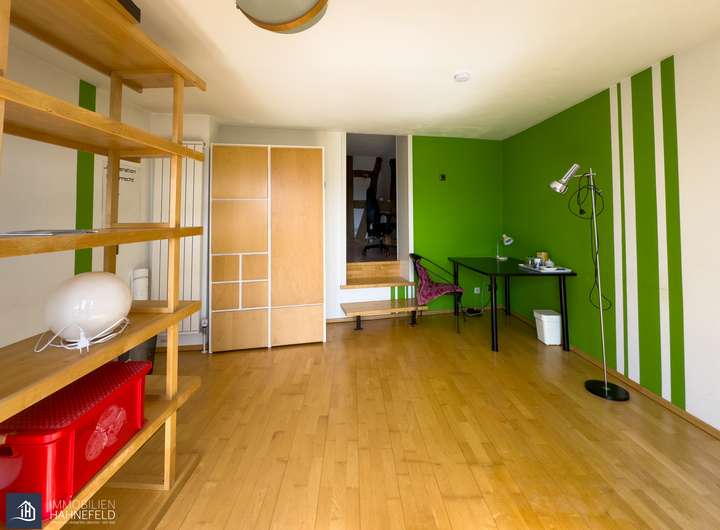 Das Erdgeschoss empfängt Sie bereits freundlich mit Fachwerk neben dem Eingangsbereich. Direkt angrenzend befindet sich ein gepflegtes Badezimmer mit Badewanne, WC, Waschtisch sowie Waschmaschinenanschluss – ideal als Gästebad oder für die Nutzung durch heranwachsende Kinder. Zwei weitere Zimmer in angenehmer Größe bieten sich auf dieser Etage als Kinderzimmer oder Homeoffice an.