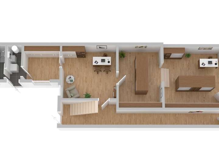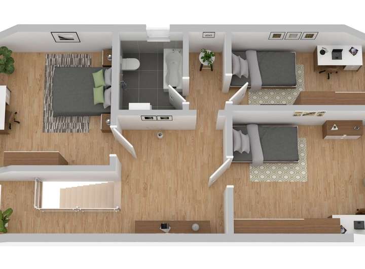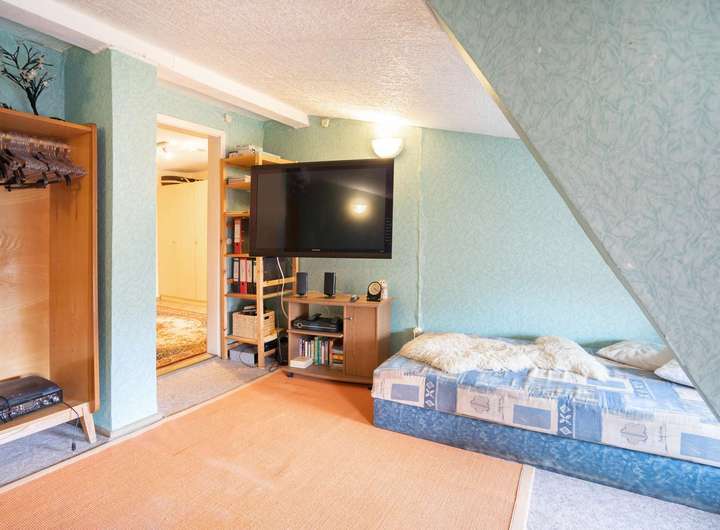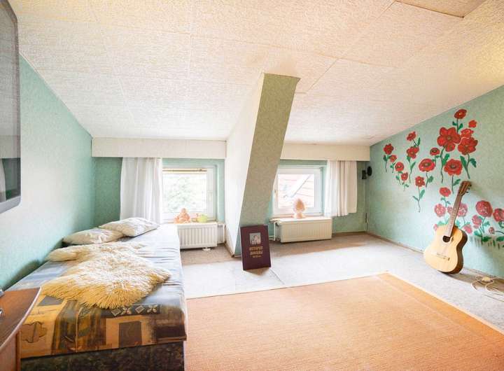 Jetzt lassen Sie uns über das Dachgeschoss reden. Dort erwarten Sie drei etwas kleinere Zimmer mit leicht schrägen Decken. Diese Räume eignen sich ideal als Kinderzimmer, oder als Gästezimmer. Ein WC gibt es auf dieser Etage auch.
