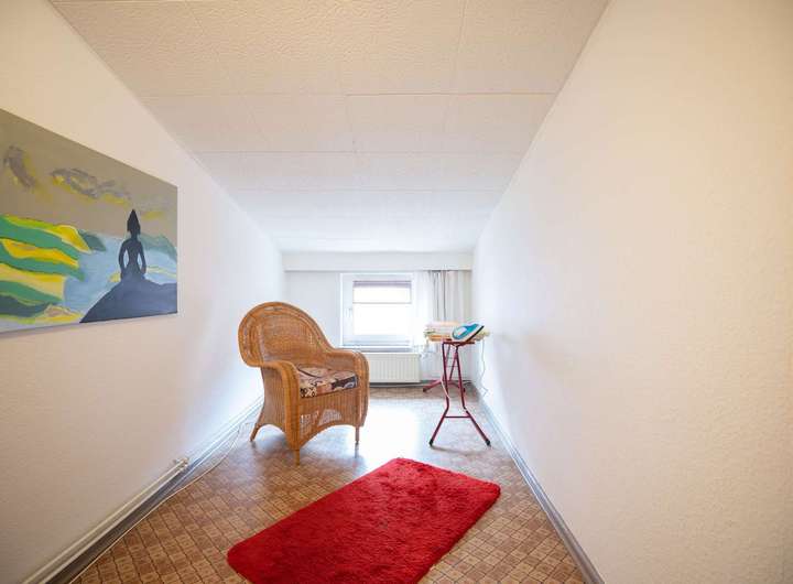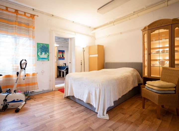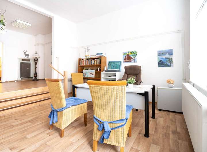 Wir betreten Ihr neues Heim durch den ehemaligen Laden (optional als Wohnung zu nutzen) und stehen direkt in einem großem „Empfangsbereich“. Von dort gelangen Sie, über drei Stufen, zum ersten Zimmer im Erdgeschoss, es diente ursprünglich als Ladenfläche, später mal als Schlafzimmer. Direkt daneben ist ein kleiner Durchgangsraum, der zu einem weiteren Zimmer führt. Vielleicht wird dies Ihr neues Büro oder ein Gästezimmer? Über eine Schiebetür gelangen Sie in einen Durchgangsraum, der zuerst in einen Hauswirtschaftsraum und dann in ein Gäste-WC mit Dusche führt.
