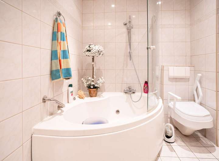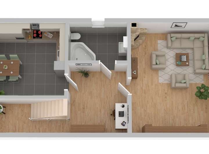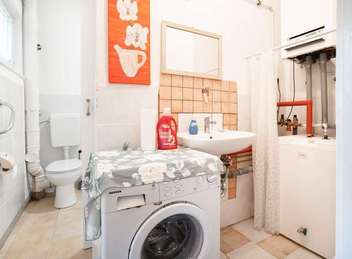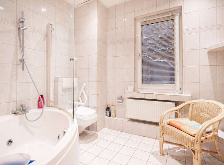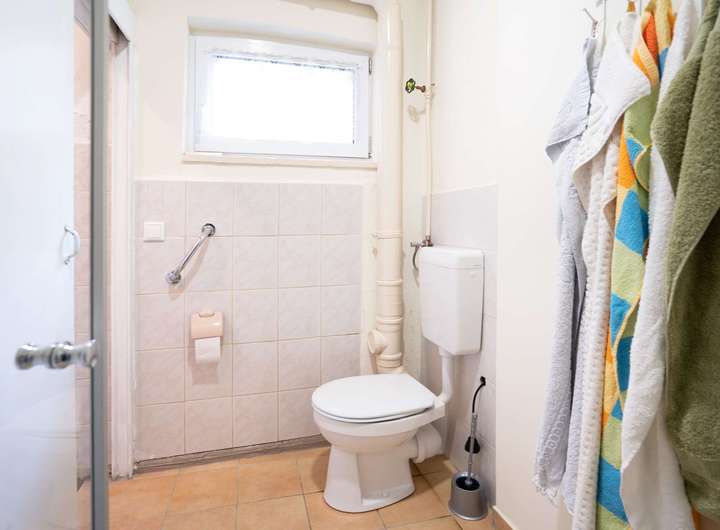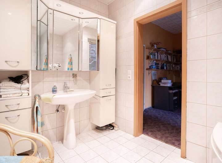 Zwischen Küche und Wohnbereich liegt ein Tageslicht-Badezimmer. Es hat eine angenehme Größe und Sie können dort in Ihrer Badewanne entspannen.