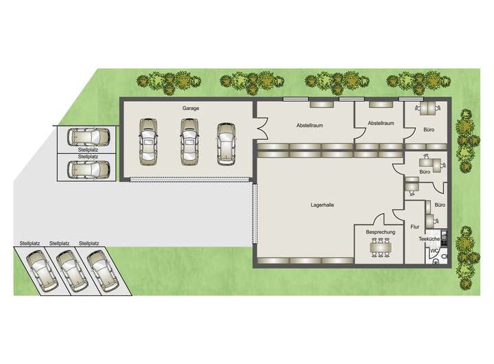 Die großzügige Gerüsthalle bietet zudem Platz für Wohnmobile und zahlreiche Parkplätze, um verschiedenste Anforderungen zu erfüllen.