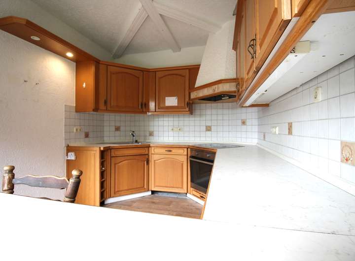 Rechts führt der Weg in das geräumige Wohnzimmer, das durch große Fenster viel Tageslicht erhält. Der angrenzende Essbereich ist offen gestaltet und verbindet sich harmonisch mit der Küche. Diese ist mit klassischen Holzelementen ausgestattet und bietet ausreichend Platz für kulinarische Aktivitäten. Vom Esszimmer aus gibt es einen direkten Zugang zur Terrasse. Hier können Sie entspannte Stunden mit Blick in den Garten genießen.