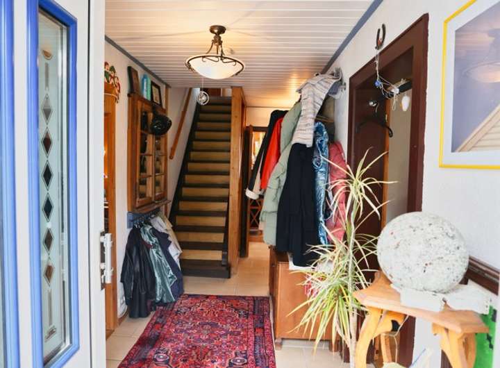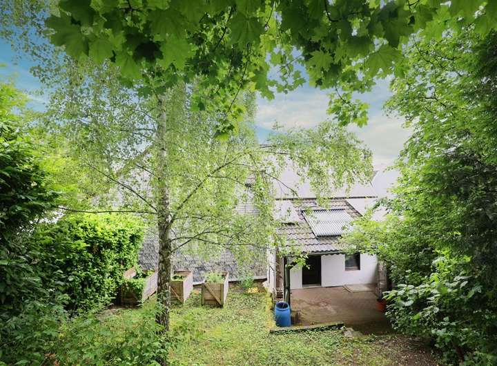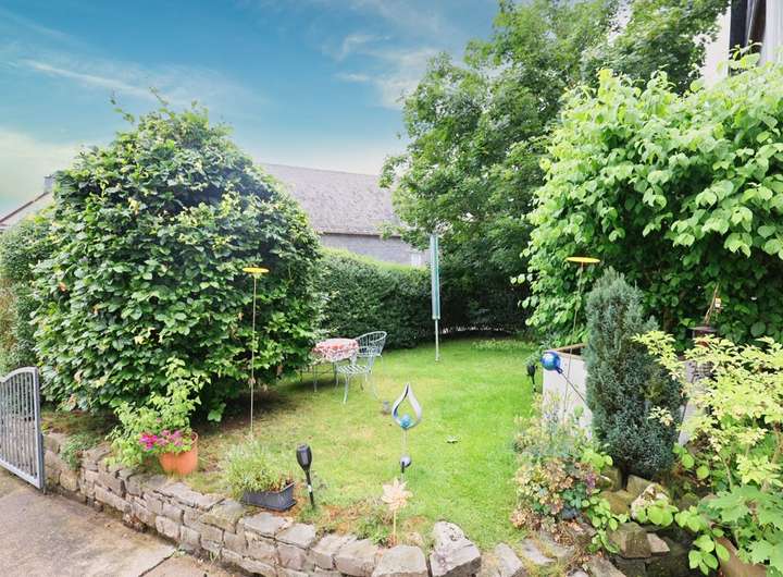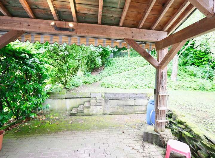 Die Außenfläche dieser Immobilie besticht unter anderem durch zwei Gartengrundstücke. Auf dem hinteren Gartenanteil findet man eine überdachte Terrasse, die zum Verweilen im grünen einlädt. Der vor dem Haus befindliche, pflegeleichte Garten ist durch die Bepflanzung mit Bäumen und Büschen von außen nicht einsehbar, sodass Ihre Privatsphäre geschützt ist.