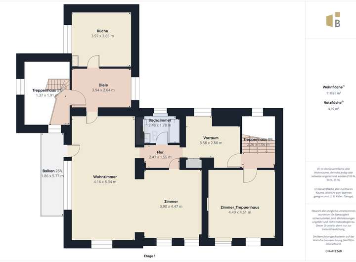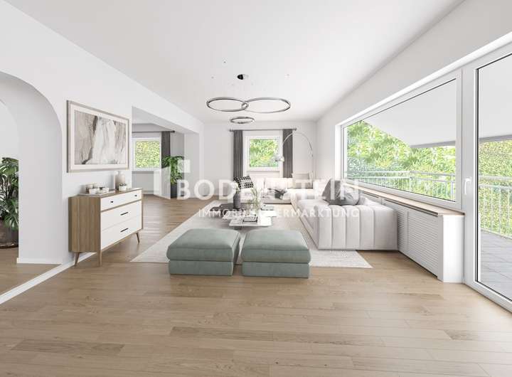 1. Obergeschoss: ca. 119 m², mit großzügigem Wohnbereich, zwei Zimmern, Bad und Balkon