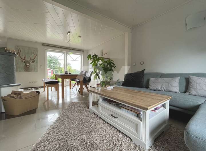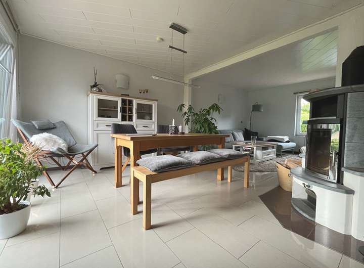 Offenes Wohnzimmer mit angrenzendem Esszimmer und Kaminofen
