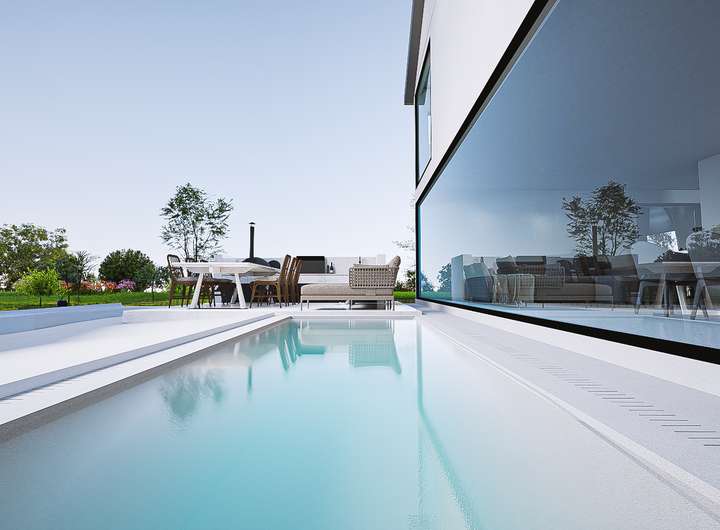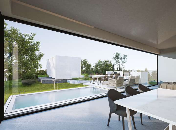 Die Panorama-Fensterfront – rahmenlos und raumhoch – öffnet das Haus zur Natur und schafft fließende Übergänge zwischen innen und außen. Hier wohnen Sie nicht nur, Sie erleben Architektur.