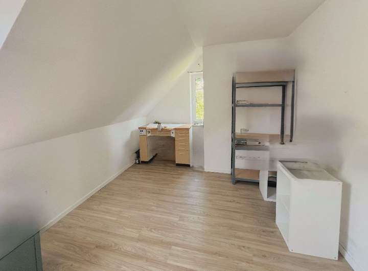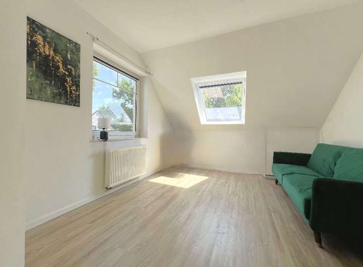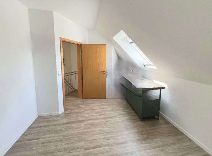 Im Obergeschoss befinden sich 3 gut nutzbare Räume - jeder Raum mit einem individuellen Zuschnitt – wegen der Bauweise – und mit einem etwas höheren Drempel als üblich, so dass die Dachschrägen optisch ansprechend und nicht störend sind! Ein vollständiges Bad mit Badewanne und Dusche ist ebenfalls vorhanden. Der Dachbodenraum bietet gute Möglichkeiten zum Verstauen der nur selten benötigten Dinge.