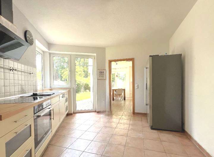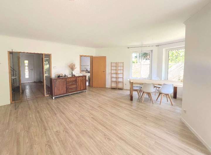 Ein großes Wohnzimmer mit Essbereich, die Küche zwar abgetrennt, aber bei offener Tür wirkt sie wie ein Bestandteil des Wohn-Essbereichs – so kann jeder Bewohner jederzeit frei entscheiden, ob ihm eine offene oder eine geschlossene Wohnküche lieber ist. Der Zugang zum Hauswirtschaftsraum erfolgt über die Küche und ermöglicht dadurch kurze Wege zu eventuellen Vorratsschränken oder auch zu einem separaten Gefrierschrank.
