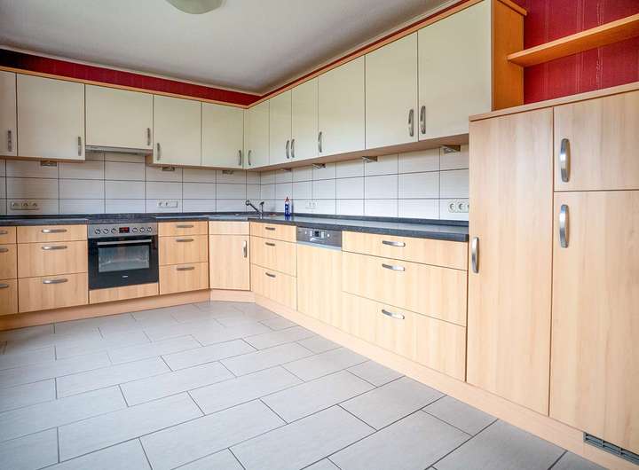 Beim Betreten des Hauses erwartet Sie zur linken Seite ein großzügiges Esszimmer, das gemeinsam mit der angrenzenden, besonders geräumigen Küche die gesamte vordere Hausfront einnimmt. Hier findet sich reichlich Stauraum und Platz für gemeinsame Kochabende oder Familienmahlzeiten. Vom Flur geradeaus gelangen Sie in das helle, freundliche Wohnzimmer mit Tageslicht und einer angenehmen Atmosphäre.