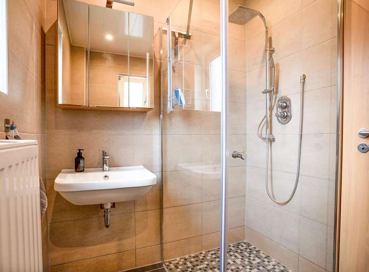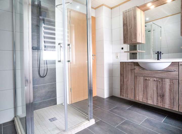 • Frisch renoviertes Badezimmer im Obergeschoss mit neuer Glasdusche