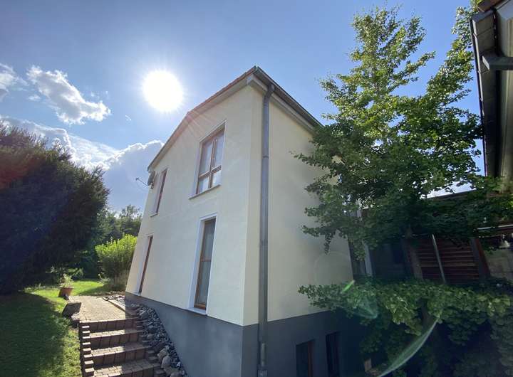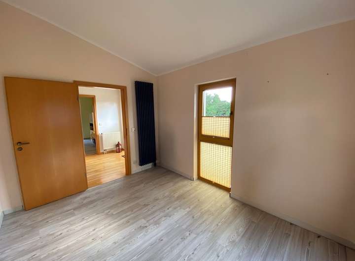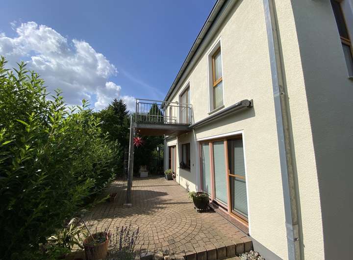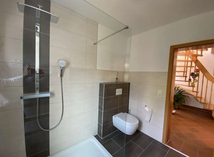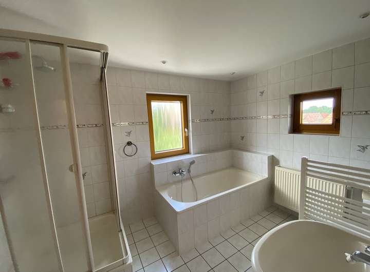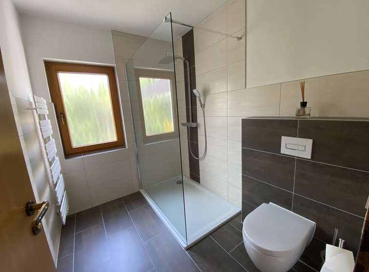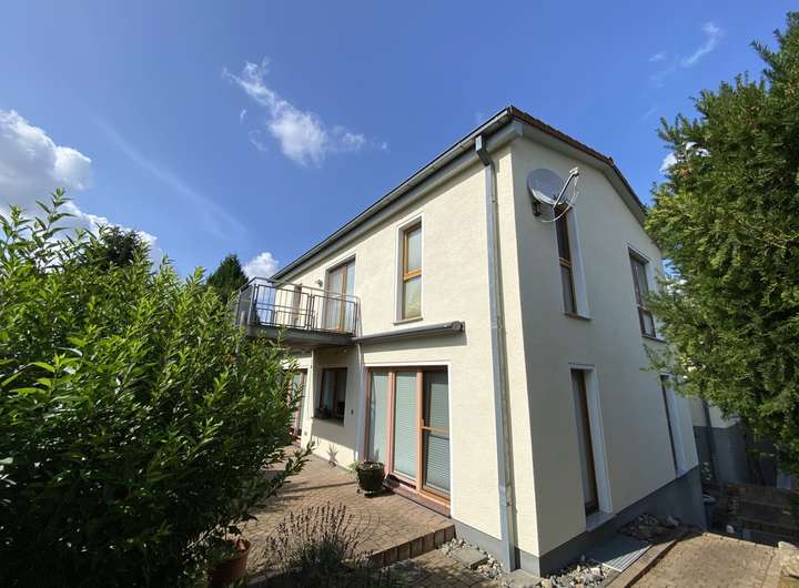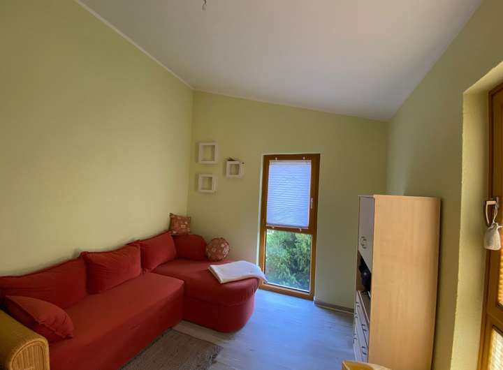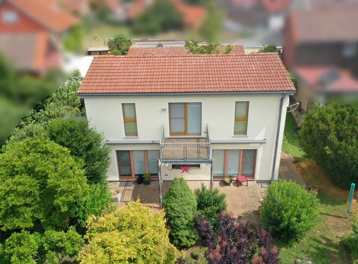 Das Wohnhaus verfügt über ca. 123 m² Wohnfläche, die sich auf zwei Etagen verteilen. Im Erdgeschoss befinden sich ein heller Wohnbereich, eine geräumige Küche mit direktem Zugang zur sonnigen Terrasse sowie ein modernes Badezimmer mit Fußbodenheizung. Große, bodentiefe Fenster sorgen für viel Tageslicht und eine freundliche Wohnatmosphäre. Die Terrasse ist sowohl vom Wohnzimmer als auch von der Küche aus zugänglich und bildet einen fließenden Übergang zum Garten – ideal für entspannte Stunden im Freien. Der gepflegte Garten bietet viel Platz für Kinder zum Spielen, für Hobbygärtner oder einfach zur Erholung im Grünen – ein echtes Highlight für Familien. Das Obergeschoss umfasst drei gut geschnittene Zimmer, ein weiteres komfortables Bad mit Fußbodenheizung und einen Balkon mit schönem Blick ins Grüne.