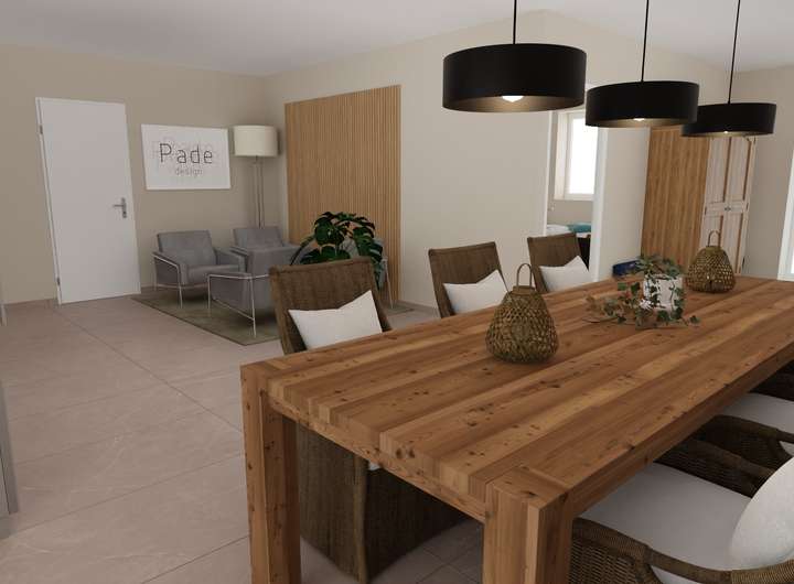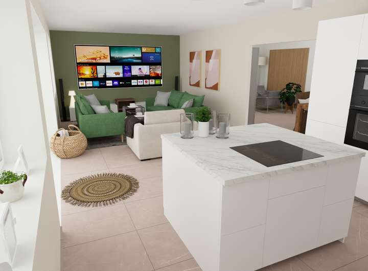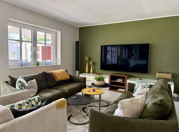 Im Herzen des Hauses befindet sich ein großzügig geschnittener, offener Wohn- und Kochbereich. Das Wohnzimmer bietet viel Platz zum Entspannen und ist mit gemütlichen Sitzgelegenheiten ausgestattet. Ein besonderer Blickfang ist der direkte Zugang zur Terrasse, der für ein helles und freundliches Raumgefühl sorgt. Die offene Einbauküche mit moderner Kochinsel ist voll ausgestattet und bietet reichlich Platz für gesellige Kochabende mit Familie und Freunden.