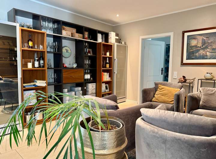 Die Diele dient nicht nur als zentrale Verbindung zu allen Räumen, sondern wird aktuell auch stilvoll als Essbereich genutzt. Ein großer Esstisch bietet Platz für gemeinsame Mahlzeiten oder feierliche Anlässe. Die stilvolle Dekoration unterstreicht den modernen Charakter des Hauses. Ergänzt wird dieser Bereich durch eine charmante Weinlounge mit zwei integrierten Weinkühlschränken, einem edlen Weinschrank mit Gläsern und einer kleinen Sitzecke – dekorativ mit Holzpaneelen und liebevollen Details gestaltet.