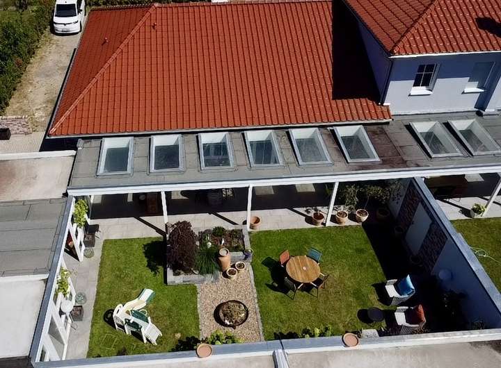 Der außenliegende Terrassenbereich ist ein echtes Highlight: Mehrere überdachte sowie offene Sitzmöglichkeiten, ein gepflegter Rasen und dekorative Pflanzenelemente schaffen eine grüne Wohlfühloase. Perfekt für Sommerfeste, Grillabende oder ruhige Stunden im Freien. Genügend Außenstellplätze sorgen für komfortables Parken im Alltag.