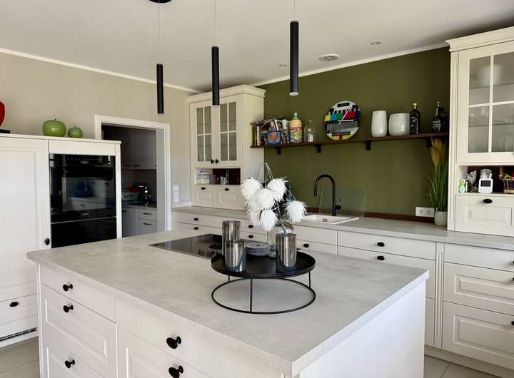 - Sehr moderne Einbauküche mit Kochinsel – stilvoll gestaltet und mit hochwertigen Geräten ausgestattet – ideal für