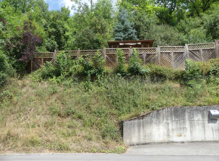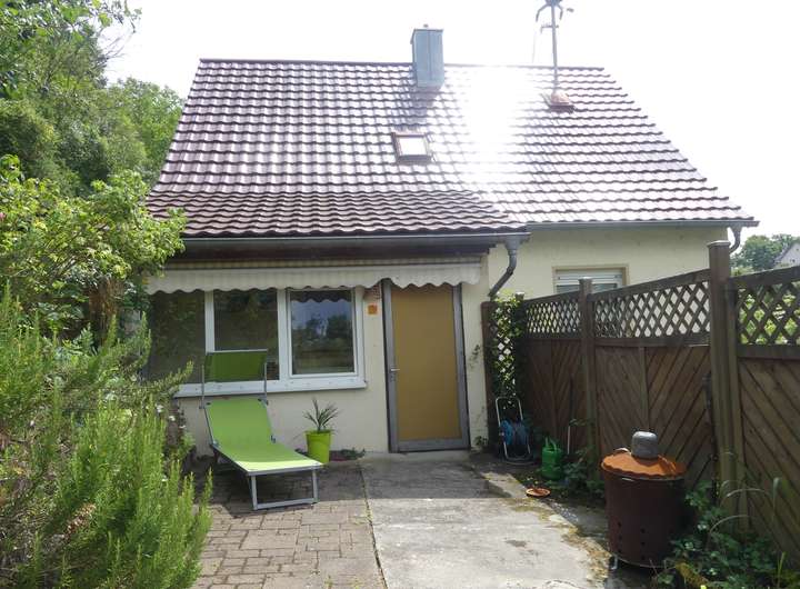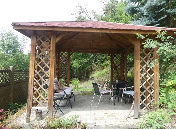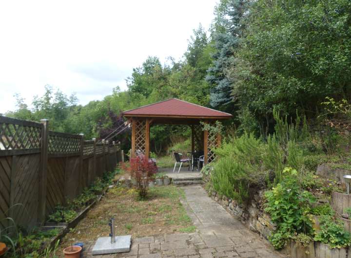 Der uneinsehbare Garten ist aufgrund der Hanglage terrassenartig angelegt und verfügt über einen Freisitz mit Pavillon auf welchem sich herrlich Feierabende verbringen lassen. Der Garten grenzt direkt an eine kleine Waldfläche, dahinter befinden sich Felder und Wiesen.