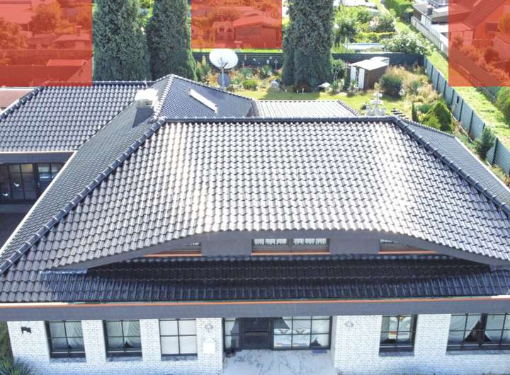 Walmdach mit Dachgauben, schwarz glasierten Dachziegeln und