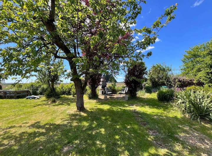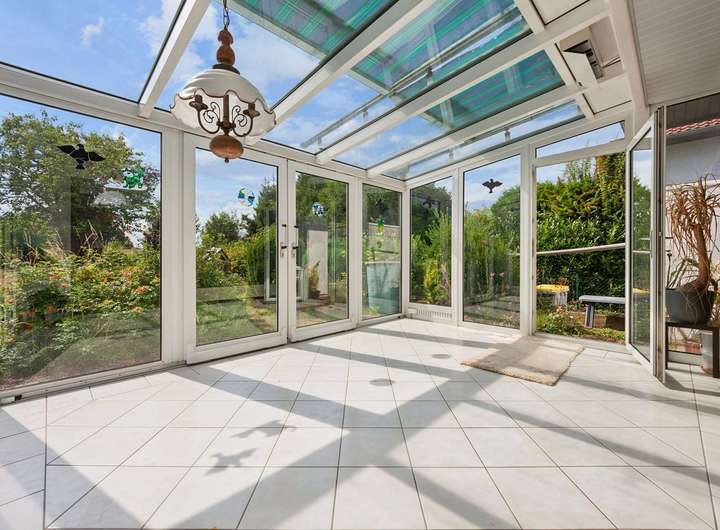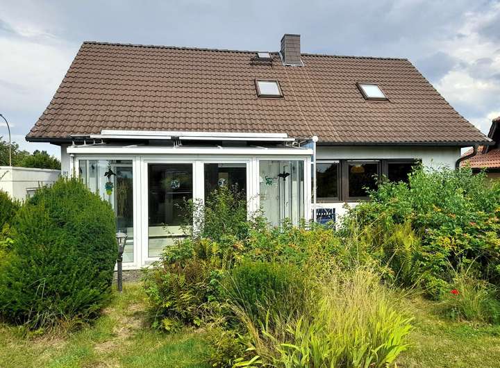 Sie betreten das Haus über einen kleinen Eingangsbereich, gleich rechts liegt das Gäste-WC, dahinter befindet sich die Küche mit Einbauzeile. Der große, helle Wohn- und Essbereich mit angrenzendem Wintergarten ist das Herzstück des Hauses. Von hier aus gelangen Sie in den gepflegten Garten, der mit seinem unverbaubaren Blick ins Naturschutzgebiet das Highlight ist.
