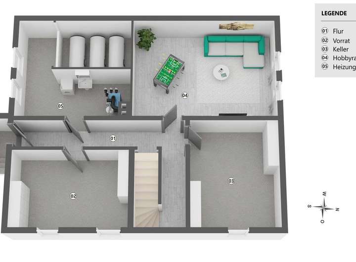 Das Haus ist ein Fertighaus von 1974. Der Keller ist in Massivbauweise bietet drei große Lagerräume und beherbergt den Brenner (von 2008, regelmäßig gewartet) sowie die Öltanks (3x 1.600 Liter). Dank einer zusätzlichen Tür können Sie von hier aus ebenfalls den Garten betreten. Das Angebot wird abgerundet durch eine Garage und einen davor liegenden Stellplatz.