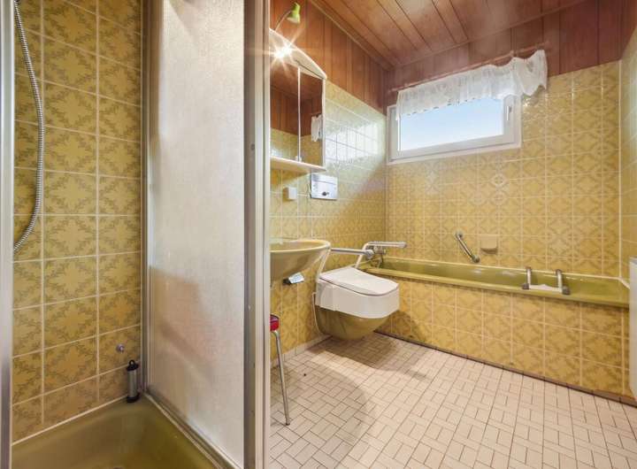 Im Erdgeschoss sind noch zwei Wohn-, bzw. Schlafräume, sowie ein Tageslicht-Badezimmer mit Dusche und Badewanne. Die Installationen funktionieren, entsprechen aber keinem modernen Standard.