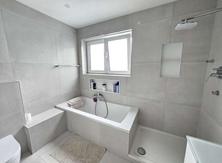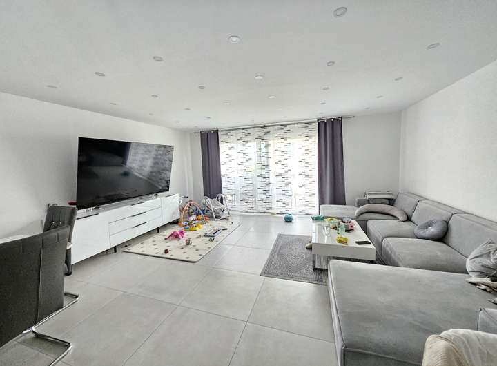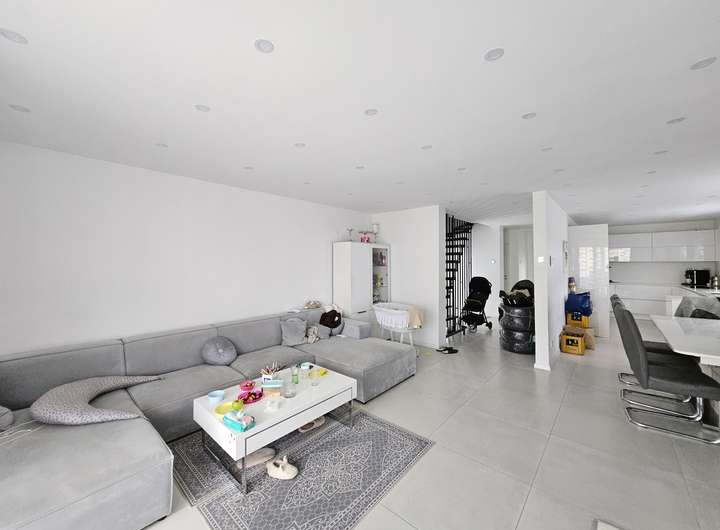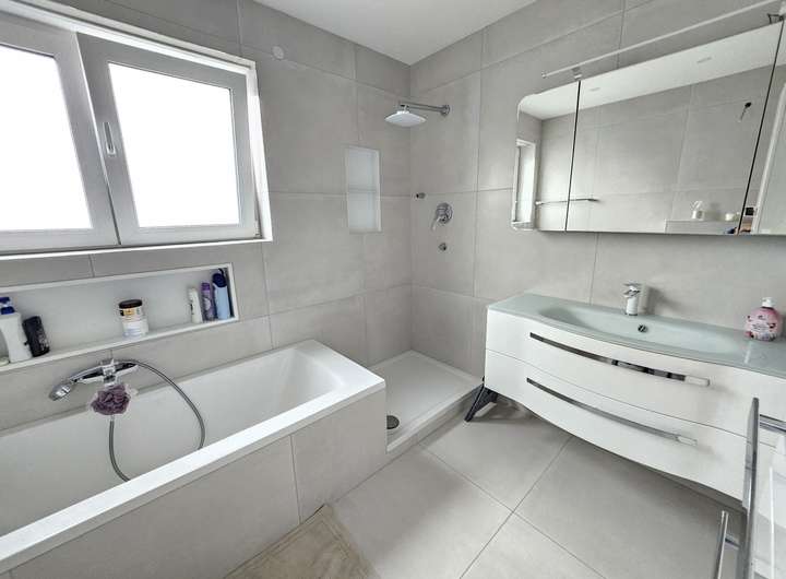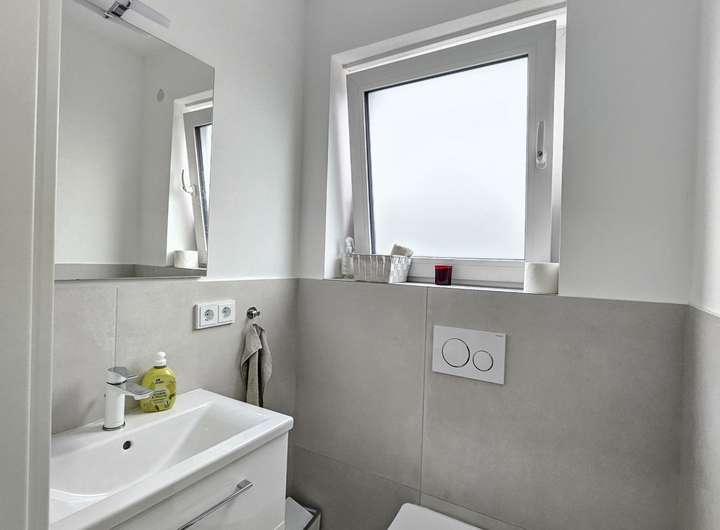 Der EG und UG sind mit hellen Fliesen belegt, die eine Betonoptik besitzen. Im OG ist der Boden mit hochwertigem Vinyl belegt, der zusätzlich eine Trittschalldämmung besitzt.