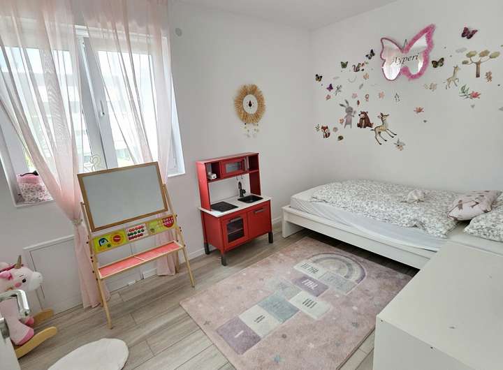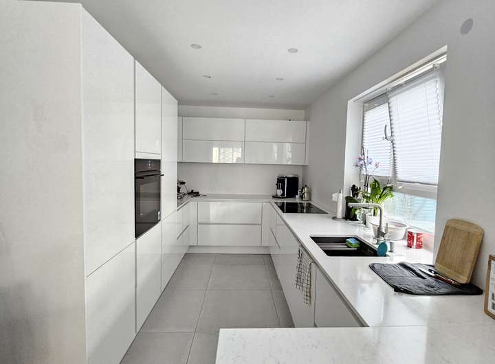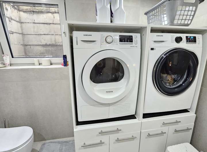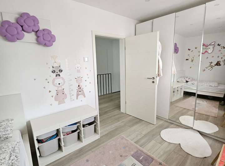 Das Haus wird mit der Einbauküche verkauft. Es ist eine Küche von der Marke Nobilia, die Arbeitsplatte ist aus Stein. Alle Elektrogeräte in der Küche, sind von der Marke Bosch und der Serie 8.