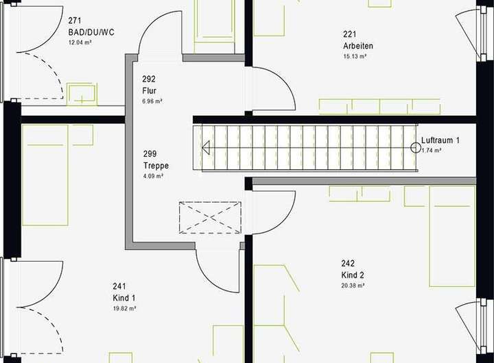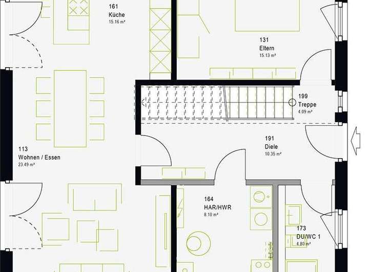 Das Highlight des Einfamilienhauses LifeStyle 15.01 (Satteldach, Walmdach, Pultdach und Flachdach möglich) ist die nahezu mittig integrierte, gerade Treppe, die beide Wohnebenen auf elegante Weise gliedert. Im Erdgeschoss ergibt sich dadurch ein einladendes Entree mit großer Diele sowie eine offene Wohn-, Ess- und Küchen-Kombination - unter dem Satteldach gruppieren sich Arbeits-, Bad- und Kinderzimmer harmonisch um den Treppenaufgang.