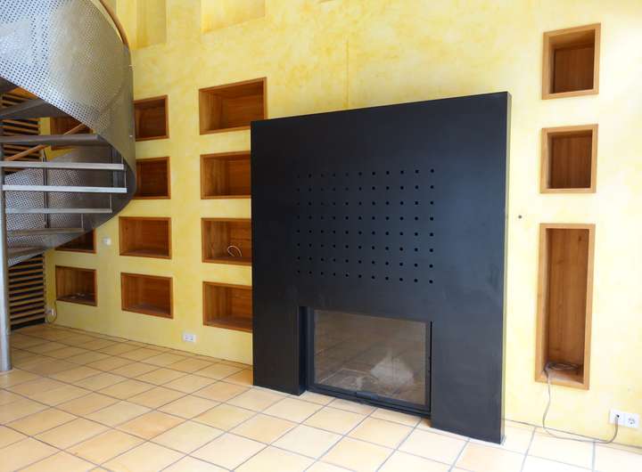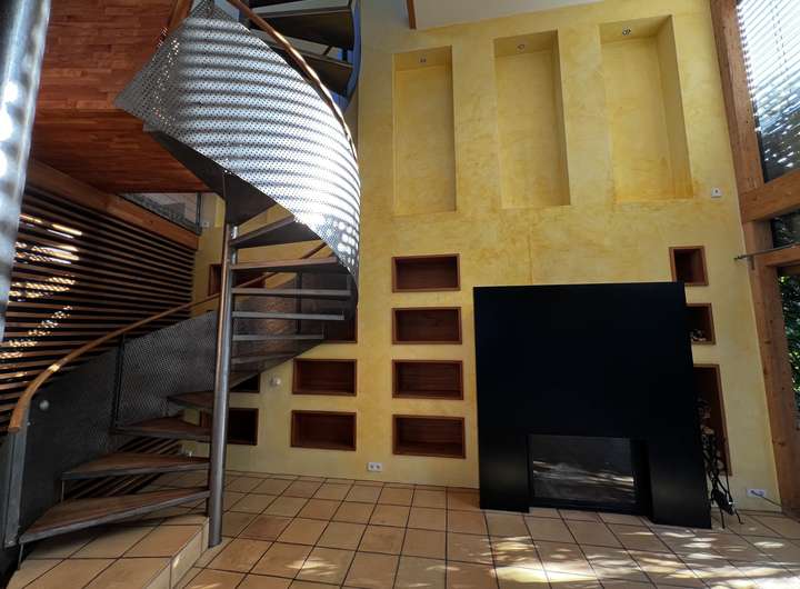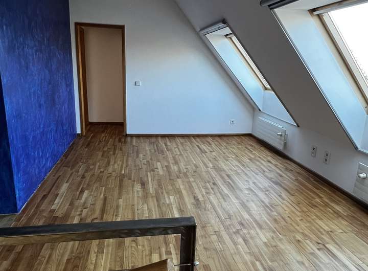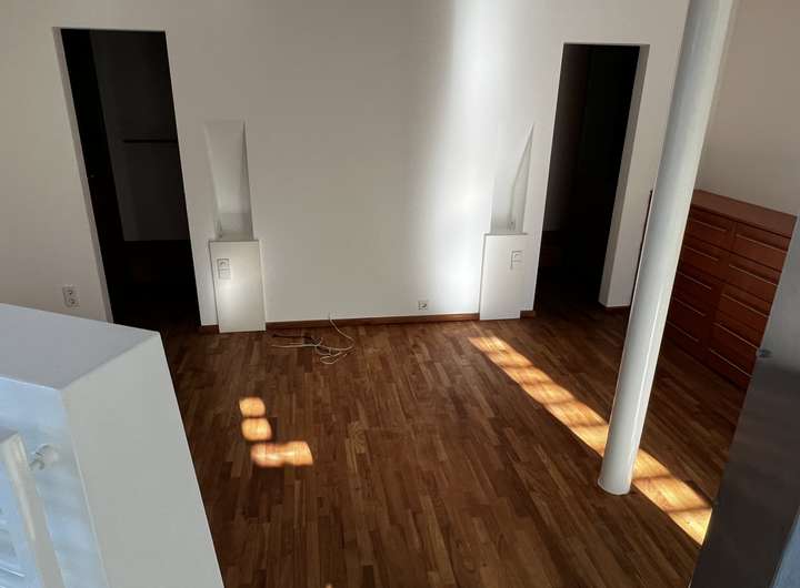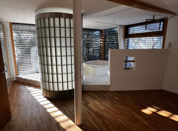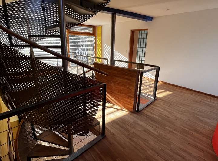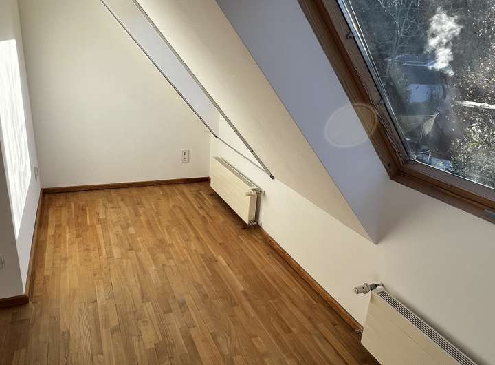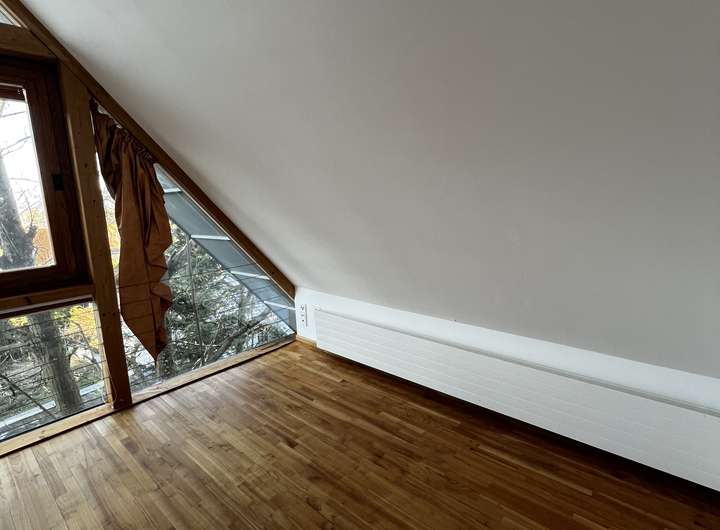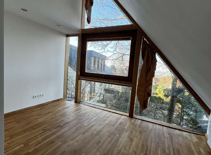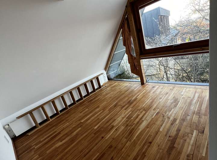 Climbing the spiral staircase once more brings you to the second floor, a versatile and family-friendly space with a layout perfectly suited for children, guests, or home offices. A central hallway connects to a bright bathroom with shower and a ceilingwindow, as well as a cozy room—ideal as a child’s bedroom or study—also illuminated by a ceilingwindow. Opposite the staircase are two additional rooms offering flexible use as bedrooms, creative spaces, or multi-purpose living areas. Both feature floor-to-ceiling windows, ensuring generous natural lighting. One of these rooms includes a charming elevated loft platform accessed via an integrated ladder, perfect as a loftbed, reading nook or play zone. This top level adds a playful, adaptable dimension to the home while maintaining the bright, modern aesthetic found throughout.