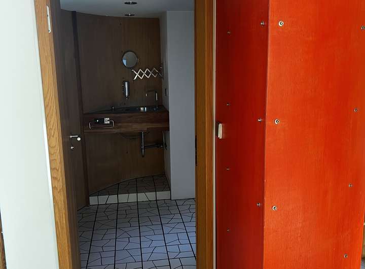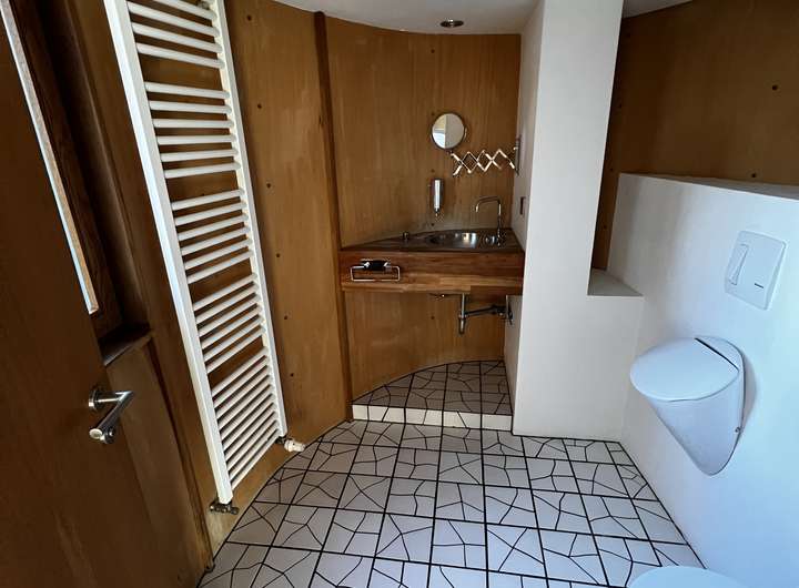 • Stylishly designed guest-restroom with a clever, space-saving layout