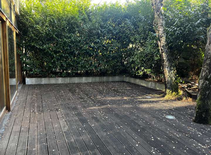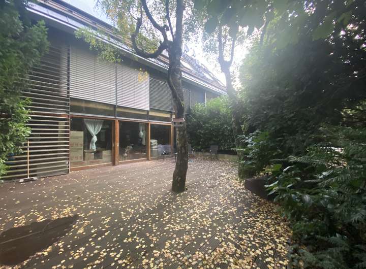 Entering the home through the private two-car garage, you step into a dedicated entry area complete with built-in shoe storage, a coat closet, and a large mirror—providing both convenience and an elegant first impression. From here, the space opens seamlessly into the expansive main living and dining area. Huge indoor fireplace, Floor-to-ceiling windows extend across the entire length of this level, offering panoramic garden views and flooding the interior with natural light throughout the day. This open-concept area flows directly onto the terrace, making it perfect for indoor-outdoor living, entertaining, or relaxing.