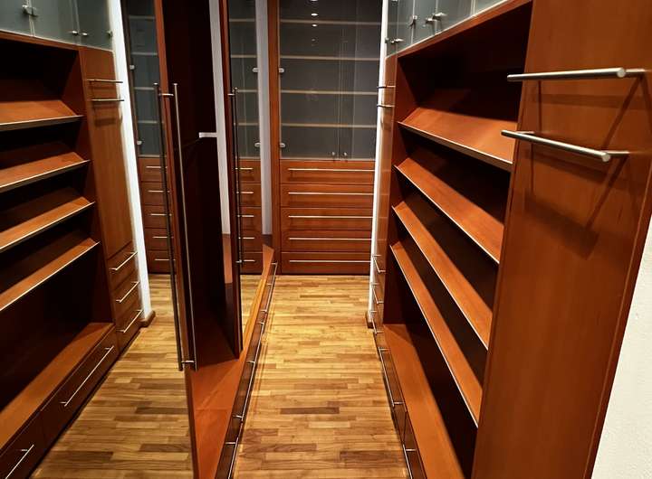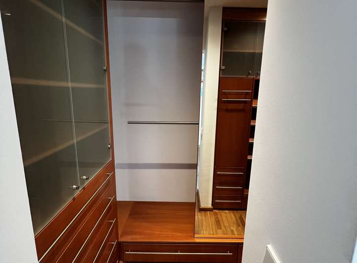 Ascending the elegant spiral staircase, you reach the first floor, which continues the home’s signature bright and airy atmosphere with full-height windows throughout. The hallway includes direct access to a private balcony and leads to a beautifully designed guest-restroom featuring a clever and space-efficient layout. The highlight of this level is the luxurious master suite, which offers a serene retreat complete with an en-suite bathroom featuring a walk-in shower, a spacious bathtub, and double sinks. The bedroom includes a customizable swivel-mounted TV fixture, an air-conditioning unit for year-round comfort, and an expansive walk-in dressing area equipped with extensive built-in cabinetry and storage options. This entire level is designed to provide privacy, comfort, and a true sense of luxury.