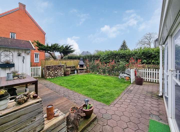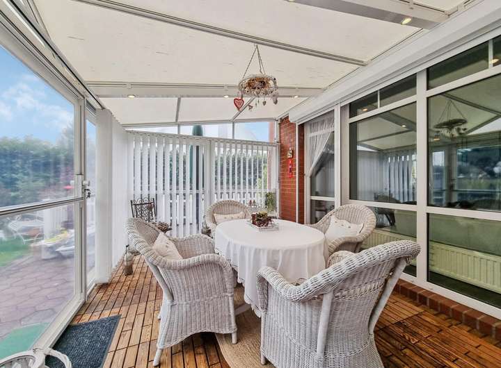 Der angrenzende Wintergarten, 2005 errichtet, überzeugt mit großen Fensterflächen, die zu jeder Jahreszeit viel Licht und ein angenehmes Raumgefühl bieten. Der Blick in den pflegeleichten, grünen Garten sorgt für Ruhe und ein Gefühl von Nähe zur Natur.