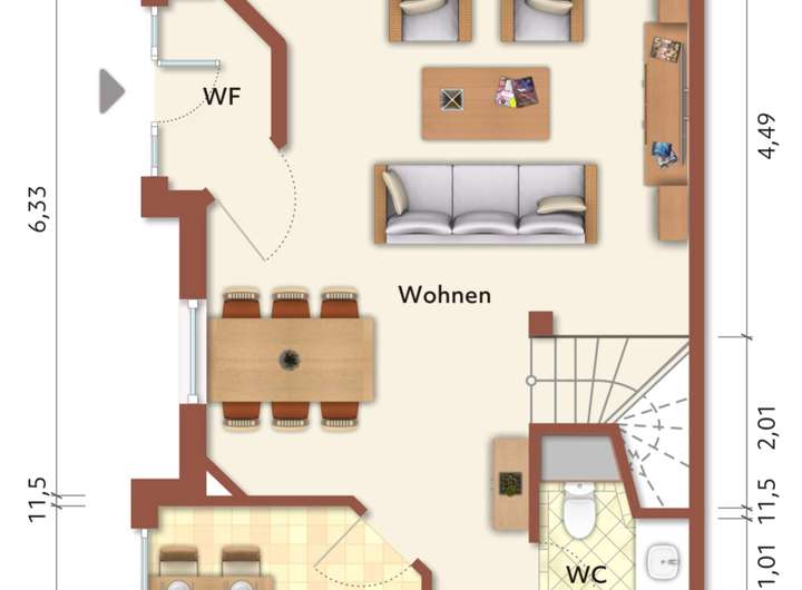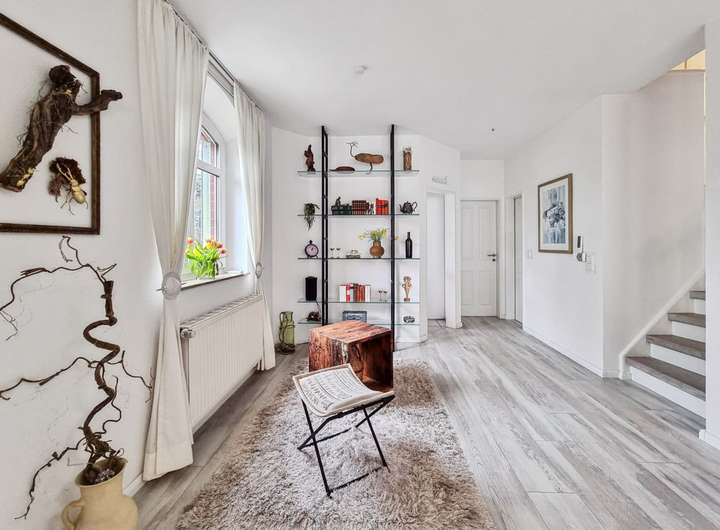 Beim Betreten des Hauses werden Sie von einem einladenden Eingangsbereich mit praktischer Garderobe empfangen. Von hier aus öffnet sich der großzügige, lichtdurchflutete Wohn- und Essbereich, dessen offene Raumgestaltung eine harmonische Wohnatmosphäre schafft.