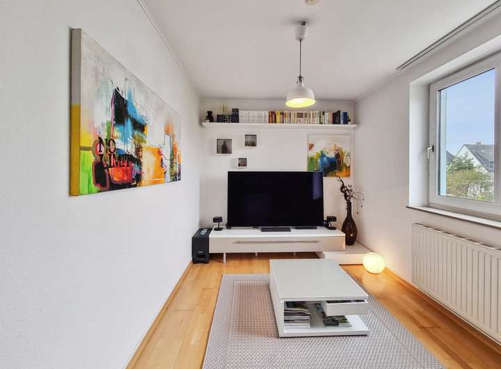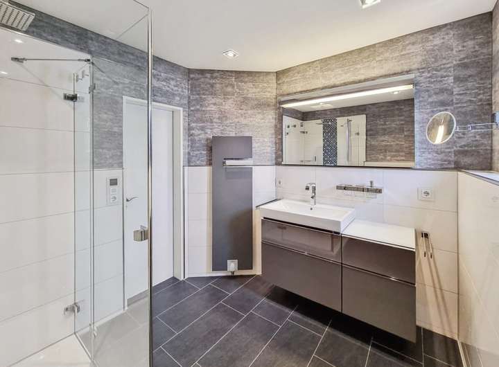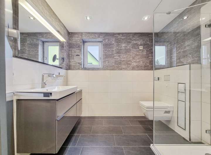 Über die elegante, weiße Landhaustreppe (modernisiert 2019) gelangen Sie in das Obergeschoss. Hier erwarten Sie drei gut geschnittene Zimmer, die sich als Elternschlafzimmer, Kinderzimmer oder Homeoffice eignen. Das modernisierte Tageslichtbad (ca. 2013) ist stilvoll gestaltet und mit einer modernen Dusche ausgestattet.