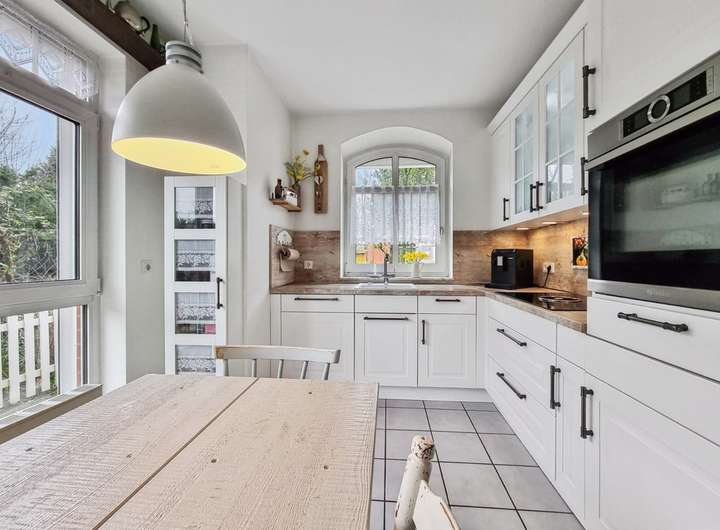 Die Küche im modernen Landhausstil (ca. 2019 erneuert) ist in praktischer L-Form angeordnet und bietet viel Stauraum sowie eine gemütliche Essecke. Bodentiefe Fenster sorgen auch hier für ein helles und freundliches Ambiente. Im Erdgeschoss befinden sich außerdem ein Hauswirtschaftsraum mit zusätzlichem Außenzugang – ideal für kurze Wege in den Garten – sowie ein Gäste-WC, das das Raumangebot sinnvoll ergänzt.