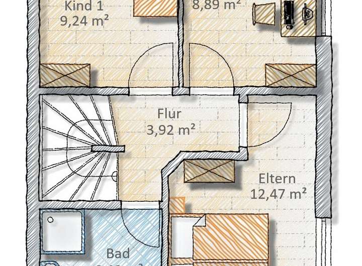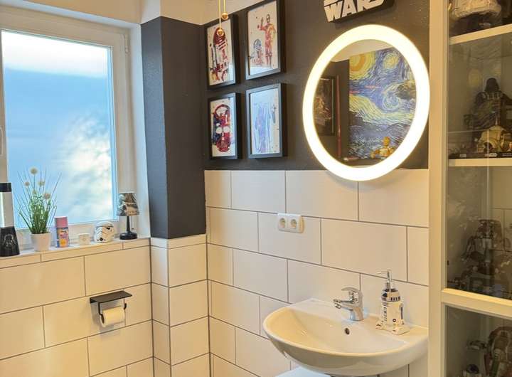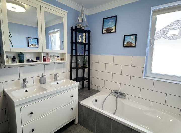 Im Obergeschoss stehen Ihnen drei gut geschnittene Zimmer zur Verfügung – perfekt als Schlaf-, Kinder- oder Arbeitszimmer. Das moderne Vollbad mit Wanne und Dusche überzeugt durch zeitloses Design und hochwertige Ausstattung.