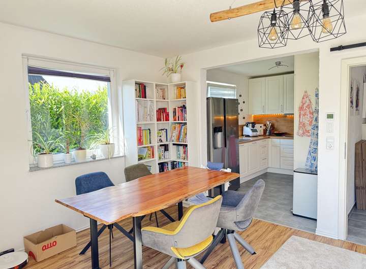 Im Erdgeschoss bildet das helle Wohn- und Esszimmer mit bodentiefen Terrassentüren das Herzstück des Hauses. Von hier aus gelangen Sie direkt in den kompakten Garten – ideal für entspannte Stunden im Freien. Die elegante Einbauküche stammt aus dem Jahr 2021 und fügt sich stilvoll in den offenen Wohnbereich ein. Ein Gäste-WC und der Hauswirtschaftsraum komplettieren das Raumangebot auf dieser Ebene.