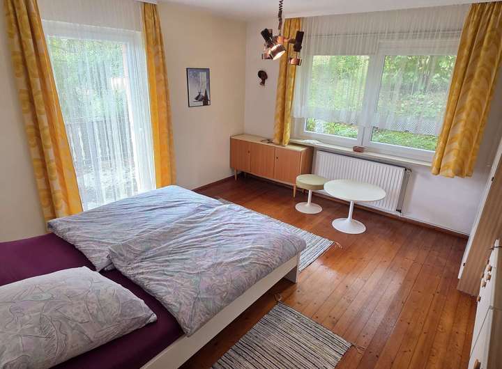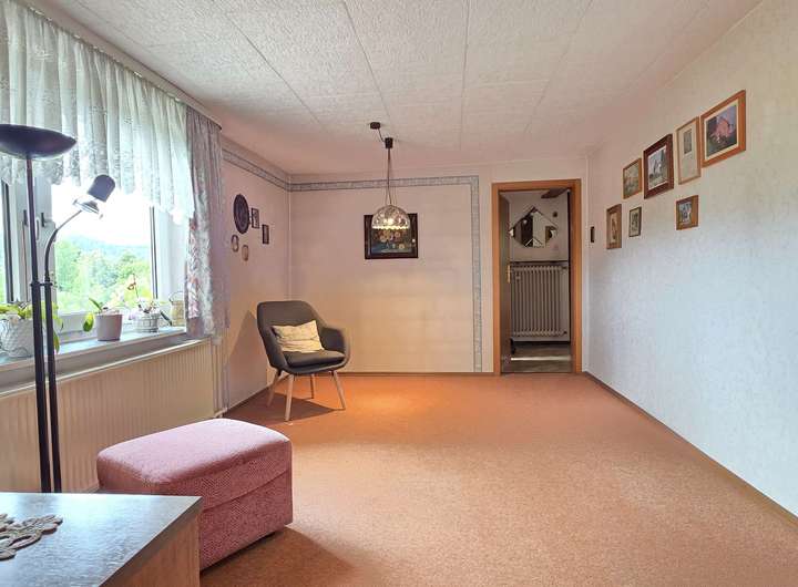Hauseingang, Diele, Flur, große Wohnküche, Duschbad mit WC und Fenster, Wohnen/Essen/Arbeiten, großes Wohnzimmer mit Balkon, Zugang zum Wintergarten und vor dort auf den zweiten Balkon. Von allen Balkonen haben Sie Fernsicht. Vom Wintergarten können Sie direkt raus in den traumhaften Garten. Nur wenige Schritte hoch zum idyllischen Gartenhaus, mit Stromanschluss.