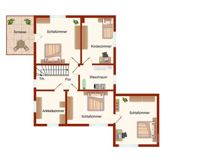 Hier finden Sie insgesamt sechs Zimmer vor. Da zwei Zimmer als Durchgangszimmer zu sehen sind, haben Sie eigentlich vier Schlafzimmer mit Ankleide oder Home-Office, je nach Nutzungspräferenz. Das klassische Elternschlafzimmer verfügt über eine große Terrasse, die direkten Gartenzugang hat.