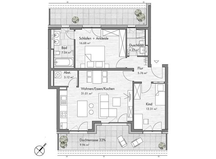 - Umlaufende private Dachterrassen mit Wasseranschluss