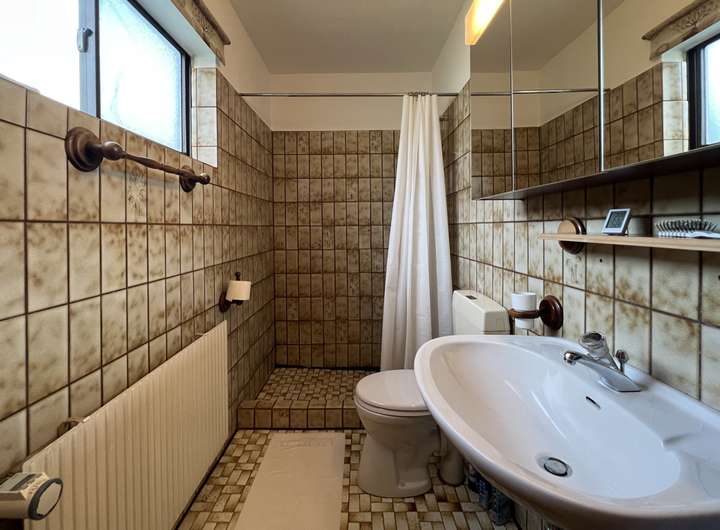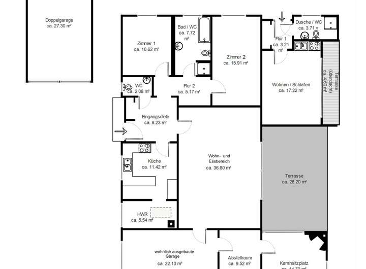 Auf ca. 134,26 m² Wohnfläche befinden sich heute drei Wohn- und Schlafzimmer, ein Gäste-WC, ein Vollbad, die Küche sowie zwei Hauswirtschaftsräume, ein geräumiger Abstellraum und eine überdachte Terrasse mit Kamin.
